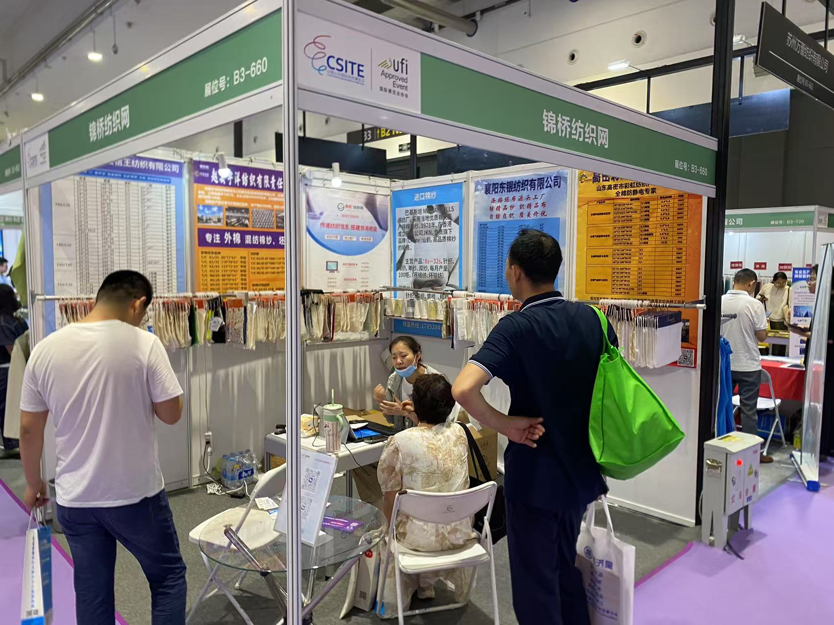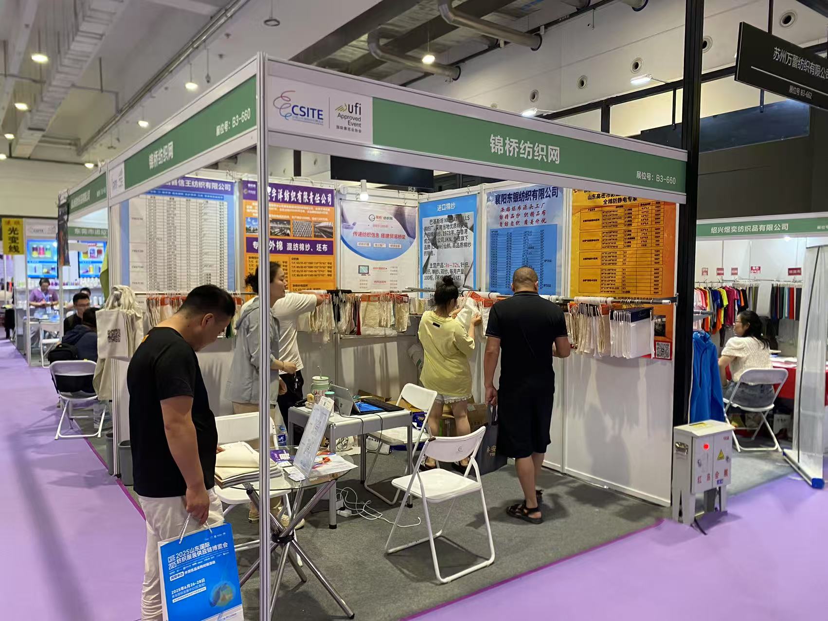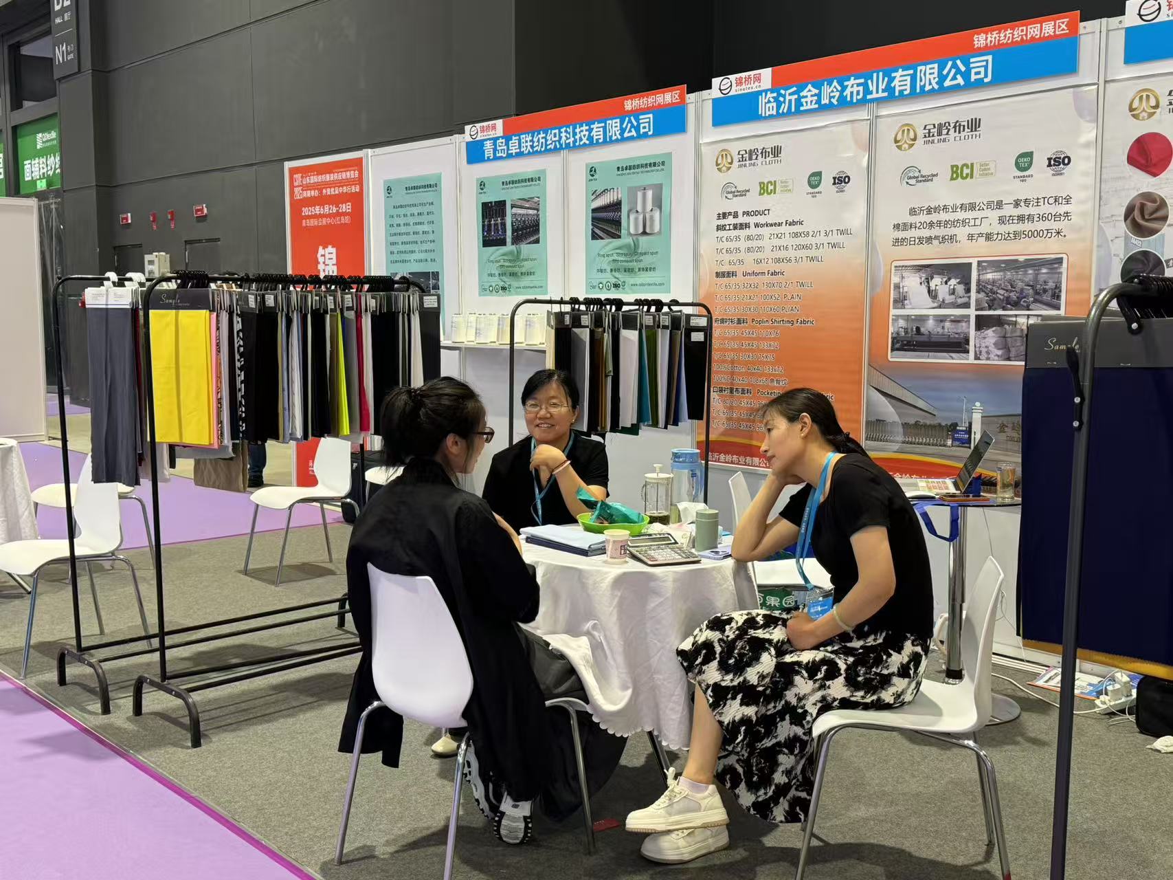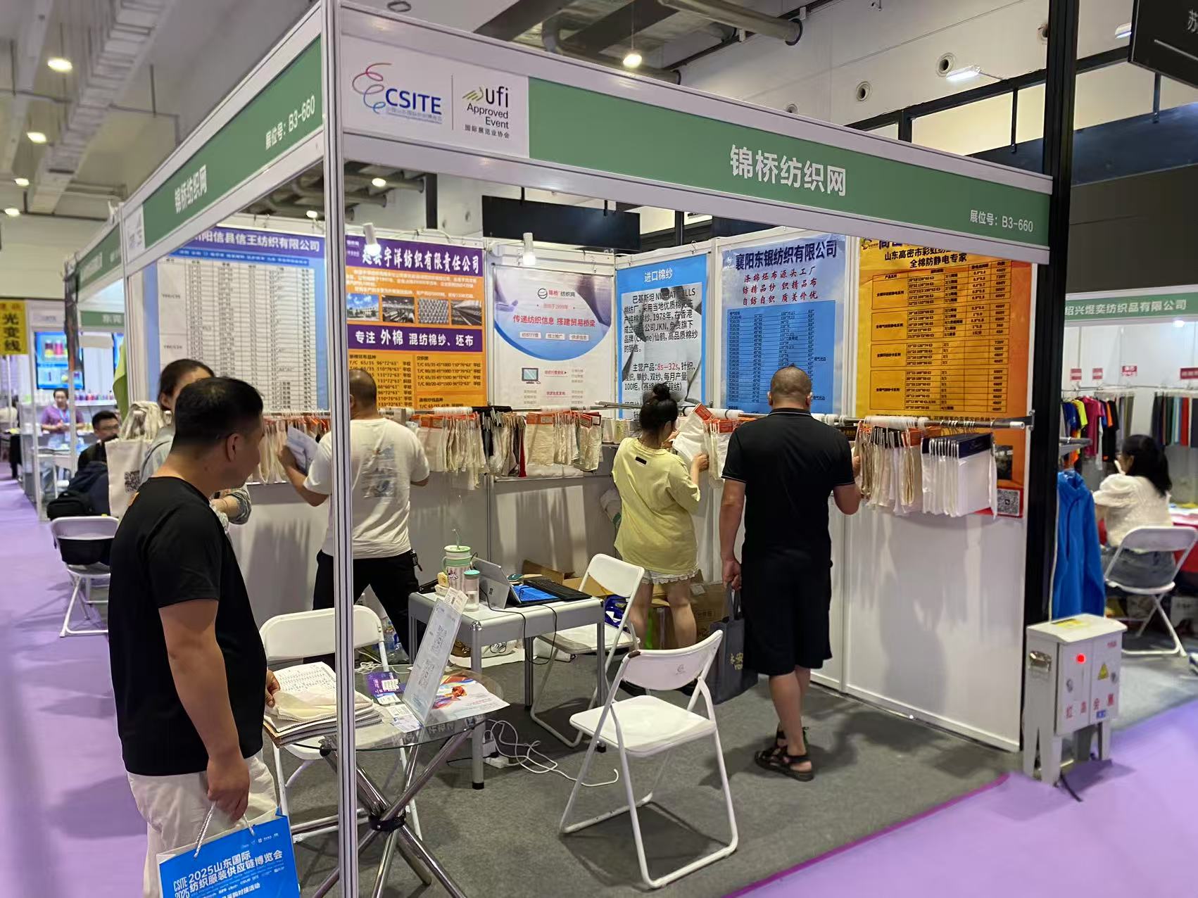 此次展會為會員客戶設立錦橋紡織網紗線坯布展區(qū),參展會員有青島卓聯(lián)紡織科技、臨沂金嶺布業(yè)、石家莊老作坊紡織、濱州信王紡織、青島綠州紡織品、保定騰潤紡織、滕州宏鷹紡織、臨沂多力佳紡織、昌邑萬寶榮盛商貿、山東佳匯棉紡織品(排名不分先后)。