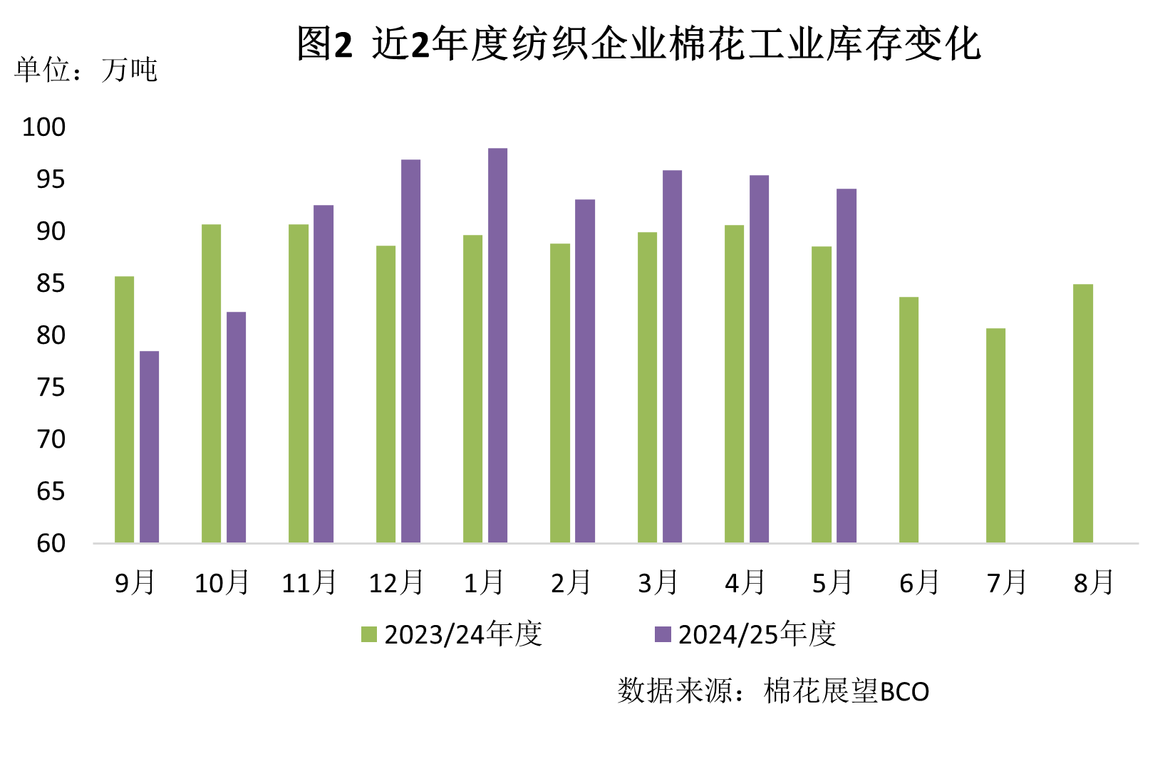 5月底,棉紡織廠棉花工業(yè)庫存穩(wěn)中略降。據(jù)調(diào)查,截至5月底紡織廠在庫棉花工業(yè)庫存量為94.1萬噸,環(huán)比下降1.3萬噸。月內(nèi)關(guān)稅戰(zhàn)擔(dān)憂有所緩解,但后市不確定性仍較強(qiáng),疊加淡季來臨,紡織隨用隨買,總體原料庫存穩(wěn)中略降。其中:26%企業(yè)增加棉花庫存,45%減少庫存,29%基本保持不變。