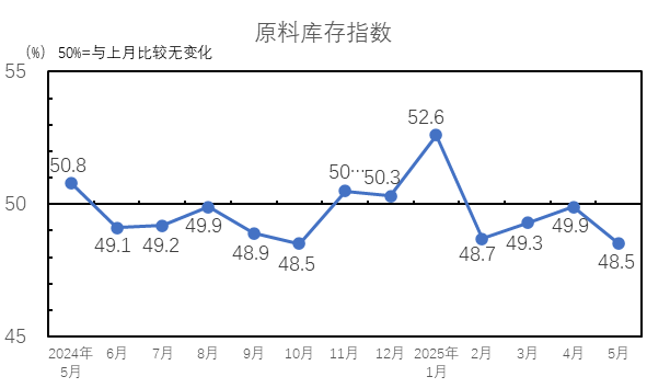 2025年5月,原料庫存指數(shù)為48.5%,低于臨界點,較4月下降1.4個百分點,行業(yè)主要原料庫存量下降。5月淡季行情持續(xù),紡織廠原料采購謹慎。棉花庫存量指數(shù)為48.7%,較4月下降1.4個百分點;非棉纖維庫存量指數(shù)為48.4%,較4月下降1.2個百分點,棉花庫存量指數(shù)和非棉纖維庫存量指數(shù)均低于臨界點。