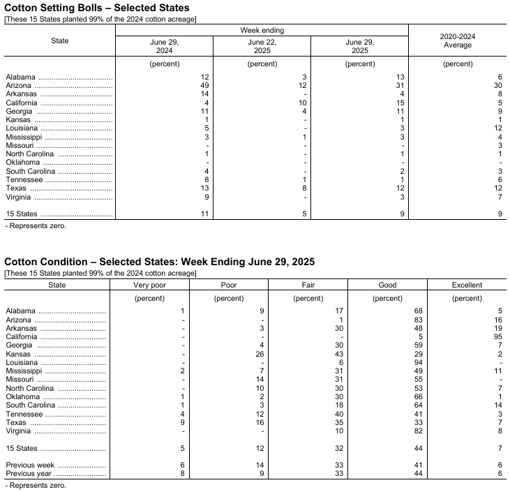 美國農(nóng)業(yè)部(USDA)在每周作物生長報告中公布稱,截至2025年6月29日當(dāng)周,美棉種植率為95%,前周為92%,去年同期為97%,五年均值為98%。美棉現(xiàn)蕾率為40%,前周為26%,上年同期為41%,五年均值為37%。美棉結(jié)鈴率為9%,前周為5%,上年同期為11%,五年均值為9%。美棉優(yōu)良率為51%,前周為47%,上年同期為50%。