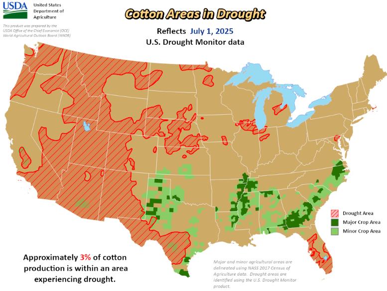 美國(guó)農(nóng)業(yè)部(USDA)下屬的首席經(jīng)濟(jì)學(xué)家辦公室(OCE)當(dāng)?shù)貢r(shí)間周四根據(jù)當(dāng)日發(fā)布的美國(guó)旱情監(jiān)測(cè)圖整理的美國(guó)農(nóng)業(yè)旱情文件顯示,截至7月1日當(dāng)周,約3%美棉產(chǎn)區(qū)受到干旱影響,仍持平于前一周。