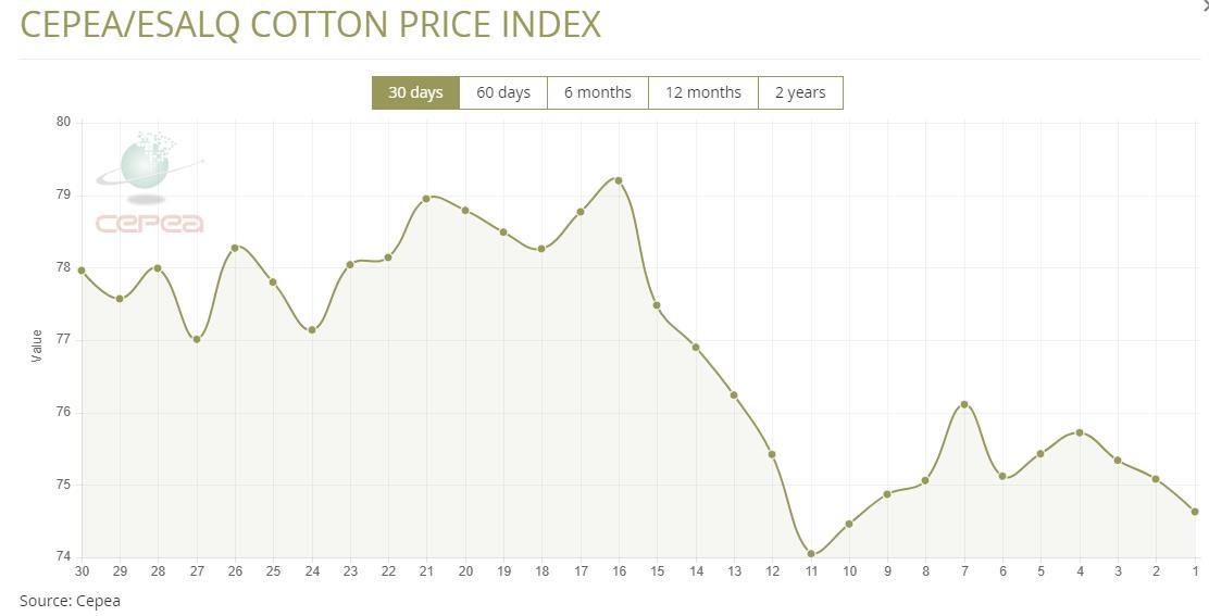 7月8日(周二),巴西CEPEA/ESALQ棉花價格指數(shù)報74.63美分/磅,較前一交易日下滑0.6%,較上月同期下跌1.94%。