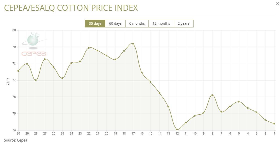 7月9日(周三),巴西CEPEA/ESALQ棉花價(jià)格指數(shù)報(bào)74.40美分/磅,較前一交易日下滑0.31%,較上月同期下跌2.25%。