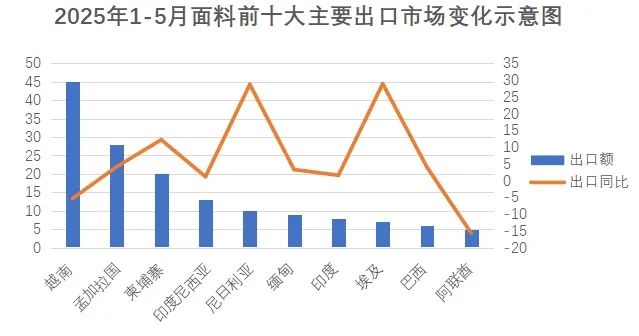 亞洲是我國(guó)面料出口主要市場(chǎng),2025年1-5月我國(guó)對(duì)亞洲國(guó)家出口面料190.9億美元,占面料出口總額的67.3%。在前十大目標(biāo)市場(chǎng)出口中,亞洲市場(chǎng)占6席。越南作為我國(guó)面料出口最大的單一市場(chǎng),占我國(guó)面料對(duì)全球出口的23.7%,出口額45.3億美元,同比下降5.3%。