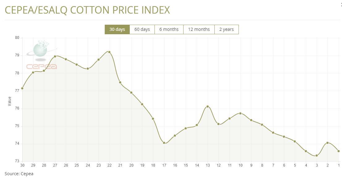 7月16日(周三),巴西CEPEA/ESALQ棉花價格指數(shù)報73.58美分/磅,較前一交易日下滑0.63%,較上月同期下跌3.32%。