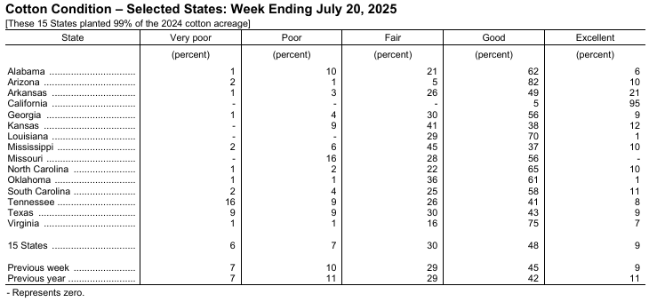 7月21日(周一),美國農(nóng)業(yè)部(USDA)在每周作物生長報(bào)告中公布稱,截至2025年7月20日當(dāng)周,美棉現(xiàn)蕾率為71%,前周為61%,上年同期為79%,五年均值為75%。美棉結(jié)鈴率為33%,前周周為23%,上年同期為40%,五年均值為33%。美棉優(yōu)良率為57%,前周為54%,上年同期為53%。