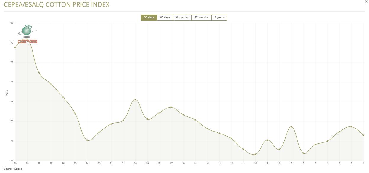 7月25日(周五),巴西CEPEA/ESALQ棉花價格指數(shù)報74.29美分/磅,較前一交易日下滑0.59%,較上月同期下跌2.39%。