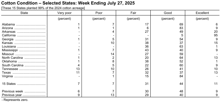 7月28日(周一),美國(guó)農(nóng)業(yè)部(USDA)在每周作物生長(zhǎng)報(bào)告中公布稱(chēng),截至2025年7月27日當(dāng)周,美棉現(xiàn)蕾率為80%,前周為71%,上年同期為86%,五年均值為83%。美棉結(jié)鈴率為44%,前周為33%,上年同期為52%,五年均值為46%。美棉優(yōu)良率為55%,前周為57%,上年同期為49%。