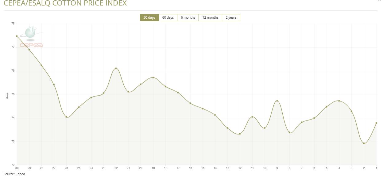 7月29日(周二),巴西CEPEA/ESALQ棉花價(jià)格指數(shù)報(bào)73.79美分/磅,較前一交易日上漲1.18%,較上月同期下跌3.05%。