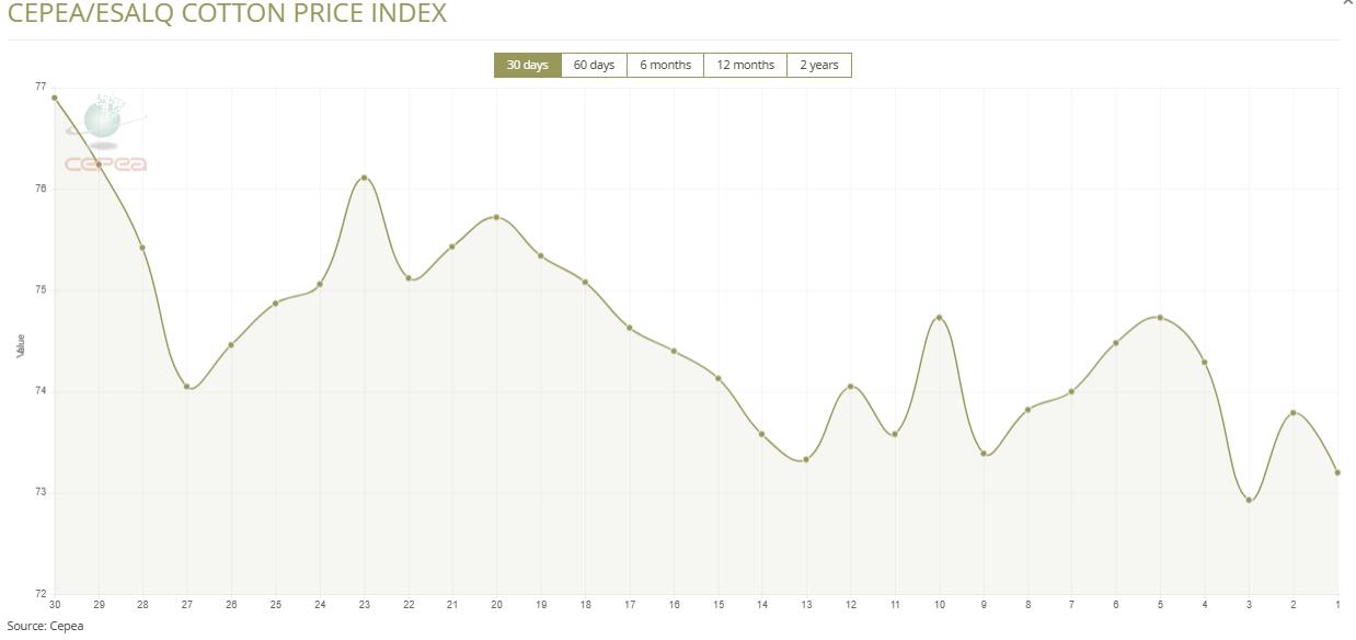 7月30日(周三),巴西CEPEA/ESALQ棉花價格指數(shù)報73.20美分/磅,較前一交易日下滑0.8%,較上月同期下跌3.82%。
