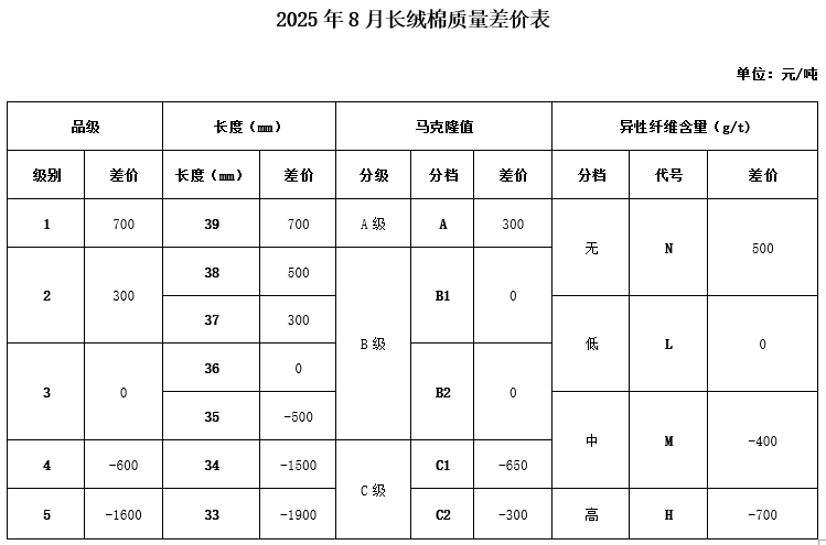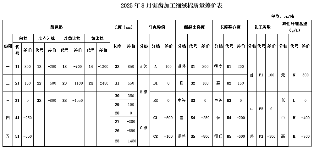 依據(jù)2025年7月的棉花公檢質(zhì)量數(shù)據(jù)、中國(guó)棉花協(xié)會(huì)質(zhì)量差價(jià)系統(tǒng)采集的加工企業(yè)銷售價(jià)和紡織廠到廠價(jià),及當(dāng)月的中國(guó)棉花價(jià)格指數(shù),并征求業(yè)內(nèi)相關(guān)專家的意見,與上月相比做出如下調(diào)整: