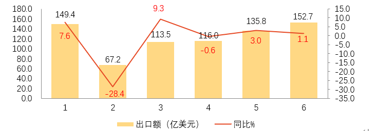 1-6月我國對“一帶一路”共建國家出口313.4億美元,同比下降3.9%,占比42.7%。對東盟出口66.3億美元,下降15.9%,占比9%。對中亞五國出口46.5億美元,大幅下降26.3%。對韓國出口32億美元,增長6.6%。對俄羅斯出口16.8億美元,下降1.6%。對拉丁美洲出口48.7億美元,增長13.8%。對非洲出口42.6億美元,增長12.3%。對海合會六國出口21.2億美元,下降5.6%。