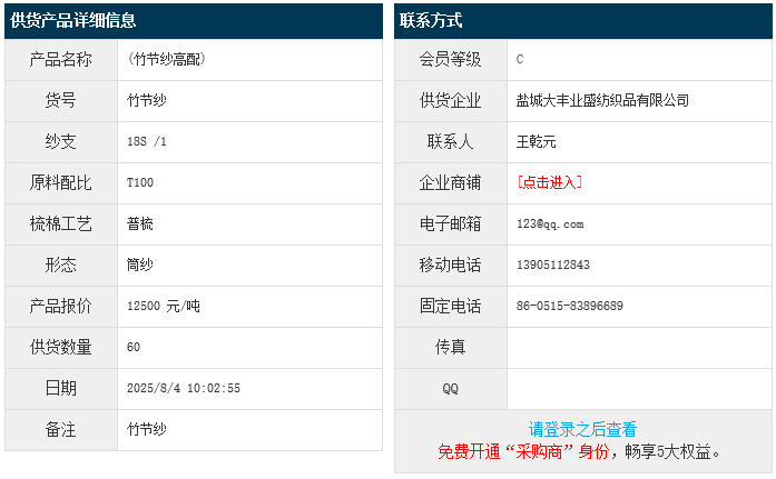 8月4日,鹽城大豐業(yè)盛紡織品有限公司純滌竹節(jié)紗T100 18S,報價為12500元/噸,實際成交價以協(xié)商為準。[點擊查看詳情]