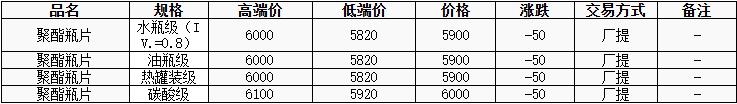 華東聚酯瓶片價格下跌50至5900元/噸,原油及原料下跌,聚酯瓶片工廠報價多下調(diào)20-100元/噸,重心隨之下行。8-9月貨源報盤5870-5950元/噸或8月期貨合約2509+20至+130元/噸,9月期貨合約2509+40至110元/噸;遞盤5820-5950元/噸,下游及貿(mào)易商逢低補貨。