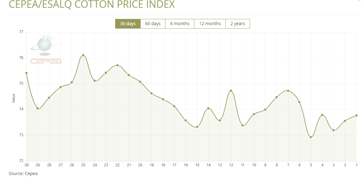 8月1日(周五),巴西CEPEA/ESALQ棉花價格指數(shù)報73.77美分/磅,較前一交易日上漲0.29%,較上月同期也上漲0.29%。