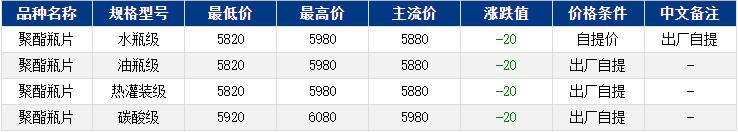 華東聚酯瓶片收于5880元/噸,漲跌值-20,原油及原料下跌,拖累成交價(jià)窄幅下行,聚酯瓶片工廠報(bào)價(jià)多穩(wěn),部分下跌20元/噸。8-9月貨源報(bào)盤5850-5940元/噸或8月期貨合約2509-10至80元/噸;遞盤較少,聽聞5840,貿(mào)易商逢低補(bǔ)貨。