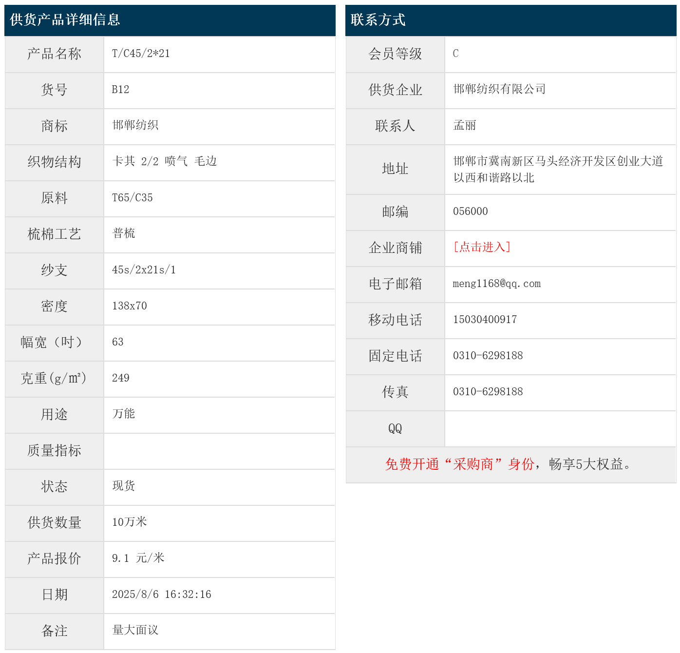 8月6日,邯鄲紡織有限公司滌棉卡其T65/C35 45/2x21 138x70 63" 2/2 249g/㎡ 噴氣 毛邊,報價為9.1元/米,實際成交價以協(xié)商為準。[點擊查看詳情]