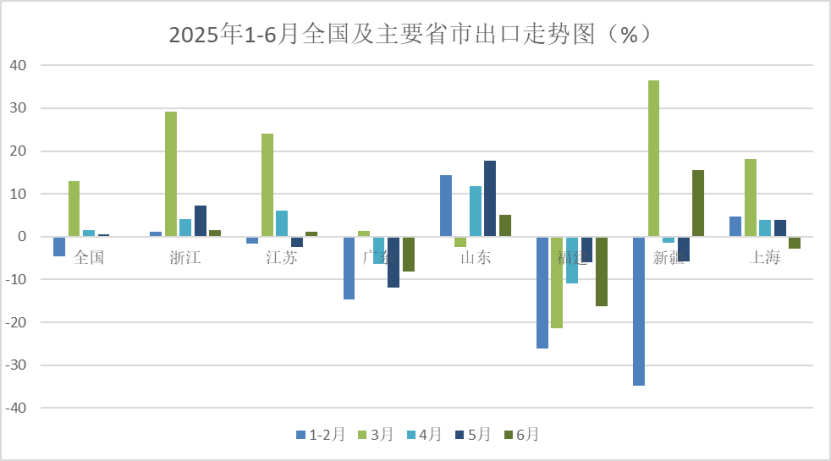 四、上半年浙江、江蘇、山東、上海出口增長,廣東、福建、新疆同比下降