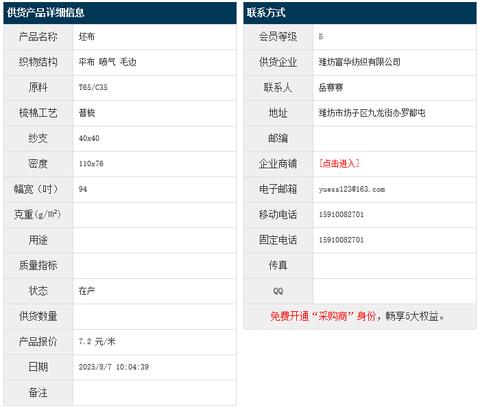 8月7日,濰坊富華紡織有限公司滌棉平布T65/C35 40x40 110x76 94" 噴氣 毛邊,報(bào)價(jià)為7.2元/米,實(shí)際成交價(jià)以協(xié)商為準(zhǔn)。[點(diǎn)擊查看詳情]