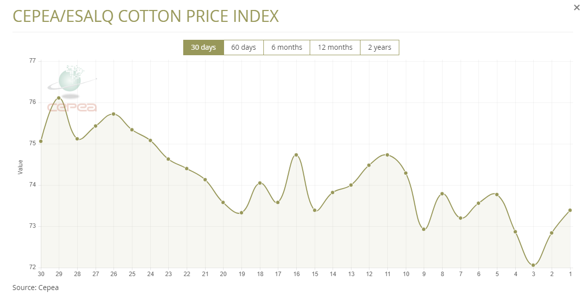 8月7日(周四),巴西CEPEA/ESALQ棉花價格指數(shù)報73.39美分/磅,較前一交易日上漲0.76%,較上月同期下跌0.23%。