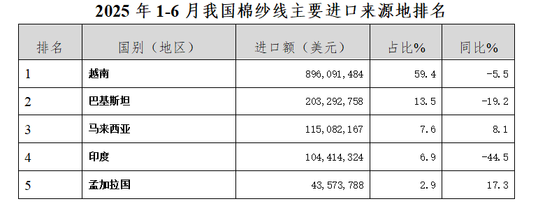 從進(jìn)口來源看,進(jìn)口棉紗的前5大來源地全部來自亞洲地區(qū),前五大來源地合計(jì)占比90%。2025年1-6月自越南進(jìn)口棉紗線40萬(wàn)噸,同比增長(zhǎng)6.6%,占棉紗線進(jìn)口總量59.5%,進(jìn)口金額達(dá)9億,同比降5.5%,占進(jìn)口總額的59.4%。我自馬來西亞和孟加拉進(jìn)口棉紗線增長(zhǎng)8.1%和17.3%,自巴基斯坦和印度進(jìn)口棉紗線下降,分別下降19.2%、和44.5%。