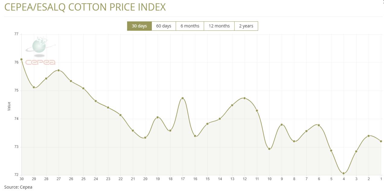 8月8日(周五),巴西CEPEA/ESALQ棉花價格指數(shù)報73.20美分/磅,較前一交易日下跌0.26%,較上月同期下跌0.49%。