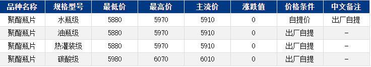 華東聚酯瓶片收于5910元/噸,漲跌值持穩(wěn),成本偏暖運(yùn)行,然而瓶片下游詢單欠佳,聚酯瓶片工廠報(bào)價(jià)部分漲15-50元/噸,報(bào)遞盤走高,成交較少。8-10月貨源報(bào)盤5900-6060元/噸;遞盤5880-5960元/噸,下游及貿(mào)易商剛需補(bǔ)貨。