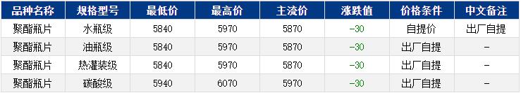 華東聚酯瓶片收于5870元/噸,漲跌值-30元/噸,成本下跌,聚酯瓶片工廠報(bào)價(jià)多下調(diào)30-50元/噸不等,重心隨之下行。8-10月貨源報(bào)盤5850-6060元/噸;遞盤5840-5900元/噸,下游及貿(mào)易商逢低補(bǔ)入。