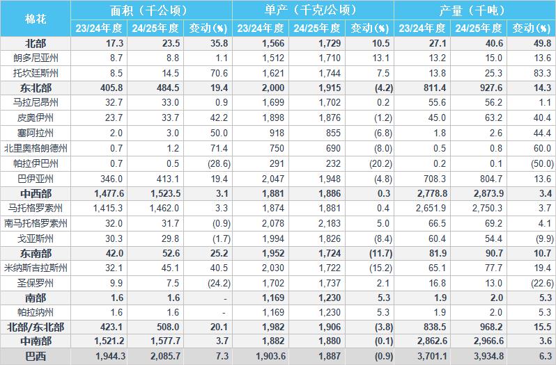 2024/25年度巴西棉花種植面積預(yù)估為208.57萬公頃,同比增加7.3%,2023/24年度為194.43萬公頃。