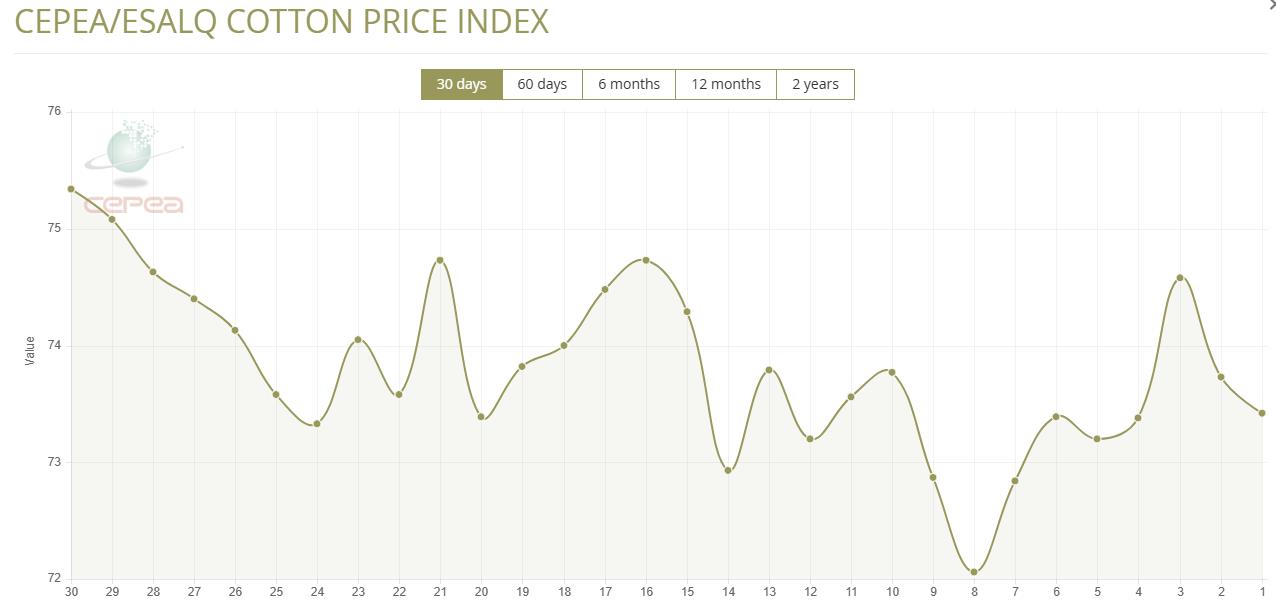 8月14日(周四),巴西CEPEA/ESALQ棉花價格指數(shù)報73.42美分/磅,較前一交易日下跌0.42%,較上月同期下跌0.19%。