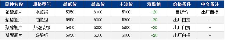 華東聚酯瓶片收于5900元/噸,漲跌值-20元/噸,聚酯原料窄幅下跌,聚酯瓶片工廠報(bào)價(jià)多穩(wěn)定,采購(gòu)氛圍欠佳,成交窄幅下行。8-10月貨源報(bào)盤5850-6000元/噸;遞盤5820-5940元/噸,成交欠佳。