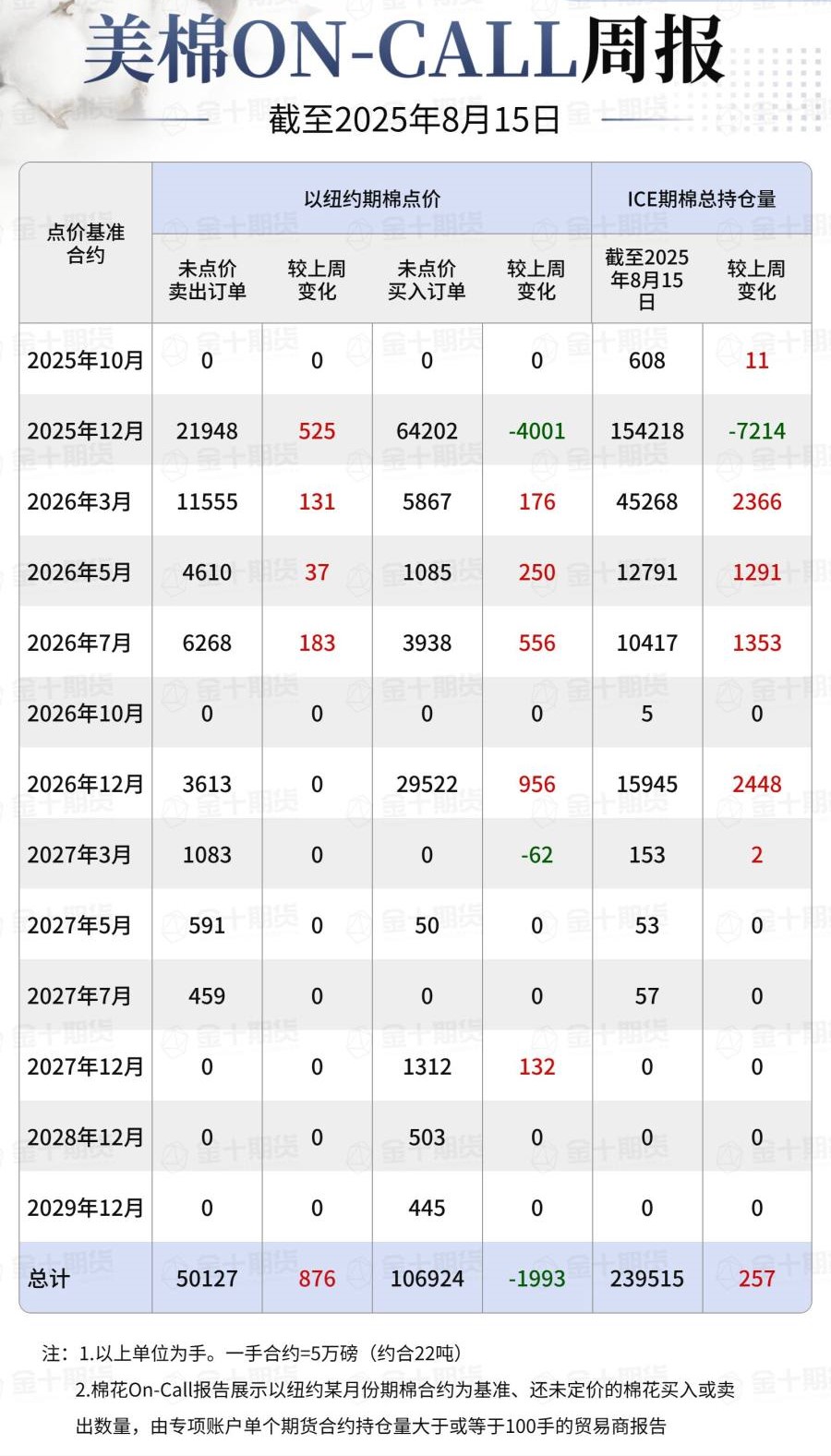 據(jù)美國商品期貨交易委員會(CFTC)最新數(shù)據(jù),截至8月15日,①美棉On-Call未點價賣出訂單50127手,環(huán)比增加876手;未點價買入訂單106924手,環(huán)比減少1993手;②ICE期棉2510合約上賣方未點價合約為0手,環(huán)比增加0手;③ICE期棉2512合約上賣方未點價合約為21948手,環(huán)比增加525手;④ICE期棉2603合約上賣方未點價合約為11555手,環(huán)比增加131手;⑤ICE期棉2605合約上賣方未點價合約為4610手,環(huán)比增加37手;⑥ICE期棉2607合約上賣方未點價合約為6268手,環(huán)比增加183手;⑦ICE棉花期貨盤面2025/26年度(8月至次年7月)的On-Call合約未點價賣出訂單為44381手,環(huán)比增加876手。