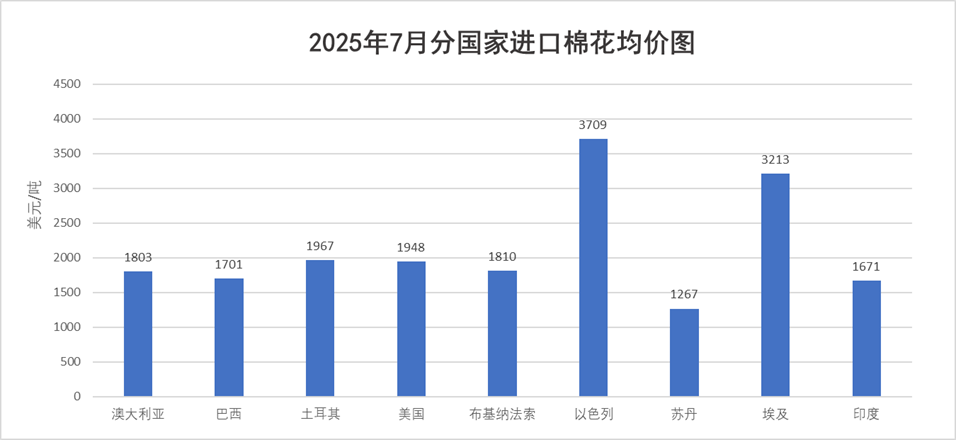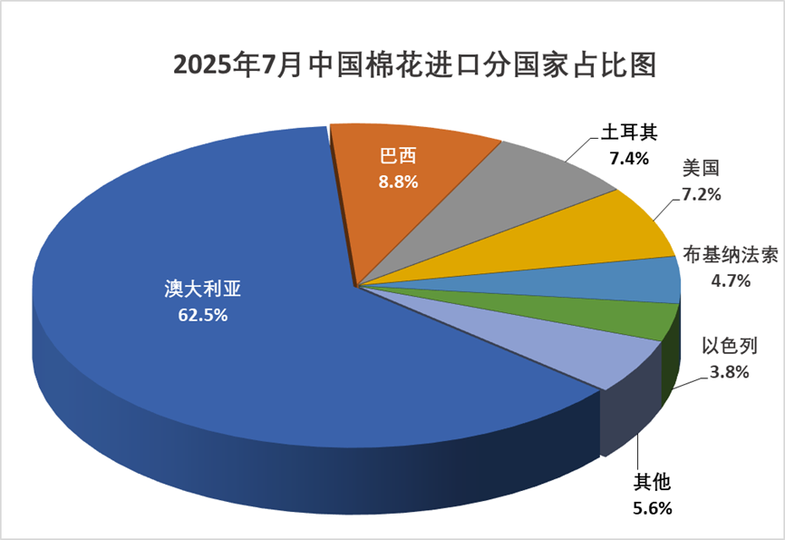 據(jù)海關(guān)總署數(shù)據(jù),7月我國進(jìn)口棉花5.3萬噸,環(huán)比增長93.5%,同比下降73.4%,澳大利亞棉花收獲加工進(jìn)度快于去年同期,有效補(bǔ)充市場資源,同時由于上月基數(shù)較低,本月澳棉進(jìn)口量環(huán)比顯著增長,占比升至首位;巴西、美國棉花進(jìn)口占比進(jìn)一步降低,排在第2、第4。2025年1-7月我國進(jìn)口棉花51.3萬噸,同比下降74.3%。2024/25年度前11個月進(jìn)口棉花98萬噸,同比下降68.2%。
