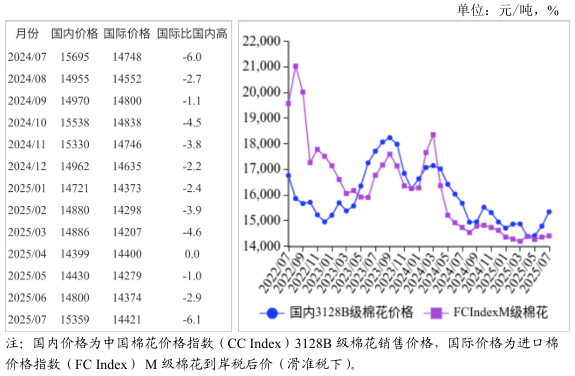 (一)國內(nèi)棉價環(huán)比小幅上漲。棉花商業(yè)庫存持續(xù)下降,供應趨緊預期持續(xù)發(fā)酵,帶動棉價小幅上漲。據(jù)中國棉花信息網(wǎng)數(shù)據(jù),截至6月底,我國棉花商業(yè)庫存283萬噸,比去年同期減13.6%,位于近7年歷史同期最低值。7月,國內(nèi)3128B級棉花月均價每噸15359元,環(huán)比漲3.8%,同比跌2.1%。鄭棉期貨主力合約(CF2509)月結(jié)算價每噸14190元,環(huán)比漲3.7%,同比漲0.4%。