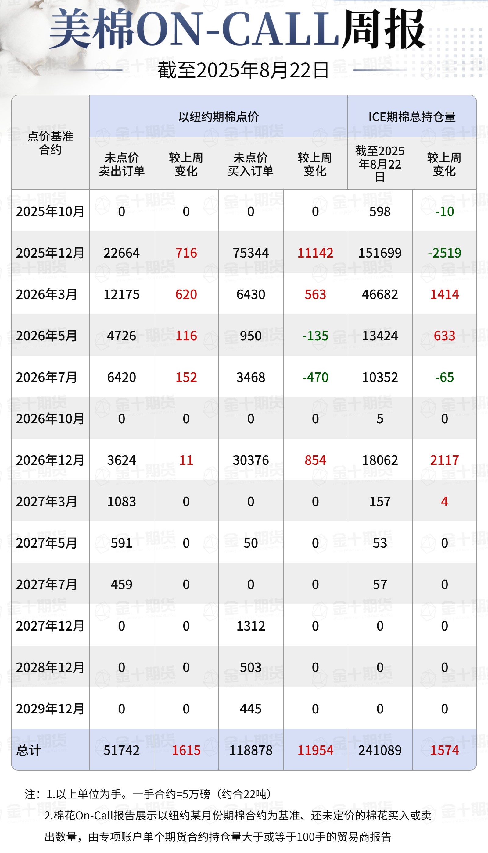 據(jù)美國(guó)商品期貨交易委員會(huì)(CFTC)最新數(shù)據(jù),截至8月22日,①美棉On-Call未點(diǎn)價(jià)賣出訂單51742手,環(huán)比增加1615手;未點(diǎn)價(jià)買入訂單118878手,環(huán)比增加11954手;②ICE期棉2510合約上賣方未點(diǎn)價(jià)合約為0手,環(huán)比增加0手;③ICE期棉2512合約上賣方未點(diǎn)價(jià)合約為22664手,環(huán)比增加716手;④ICE期棉2603合約上賣方未點(diǎn)價(jià)合約為12175手,環(huán)比增加620手;⑤ICE期棉2605合約上賣方未點(diǎn)價(jià)合約為4726手,環(huán)比增加116手;⑥ICE期棉2607合約上賣方未點(diǎn)價(jià)合約為6420手,環(huán)比增加152手;⑦ICE棉花期貨盤面2025/26年度(8月至次年7月)的On-Call合約未點(diǎn)價(jià)賣出訂單為45985手,環(huán)比增加1604手。