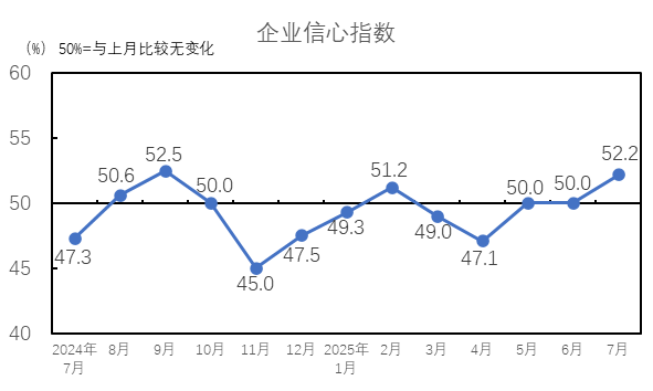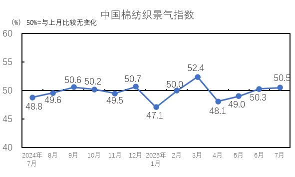 2025年7月,企業(yè)信心指數(shù)為52.2%,較6月上升2.2個百分點(diǎn),企業(yè)信心指數(shù)高于臨界點(diǎn),對未來市場的信心增強(qiáng)。7月,紡織廠經(jīng)營得到好轉(zhuǎn),且隨著傳統(tǒng)旺季臨近,企業(yè)對傳統(tǒng)旺季市場仍抱有期待,對未來市場信心增強(qiáng)。