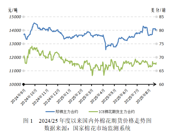 8月,美國關(guān)稅政策暫時明朗,外貿(mào)環(huán)境步入穩(wěn)定階段,美聯(lián)儲降息預(yù)期升溫,為大宗商品市場價格積蓄上行動力。美國農(nóng)業(yè)部下調(diào)產(chǎn)量并未改變國際棉市寬松格局,與此同時,年度末期國內(nèi)棉市延續(xù)緊平衡態(tài)勢,棉價呈內(nèi)強(qiáng)外弱特征,內(nèi)外棉價差攀升至本年度最高水平。