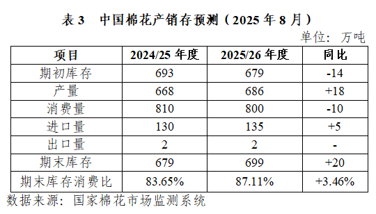 當(dāng)前新疆主產(chǎn)棉區(qū)天氣總體正常,棉花陸續(xù)裂鈴?fù)滦?,籽棉畝產(chǎn)呈增長態(tài)勢,豐產(chǎn)預(yù)期進(jìn)一步增強(qiáng),收獲時間預(yù)計(jì)提前1周左右至9月下旬,部分軋花廠按基差定價方式預(yù)售新棉。本期中國棉花產(chǎn)銷存預(yù)測平衡表未做調(diào)整。