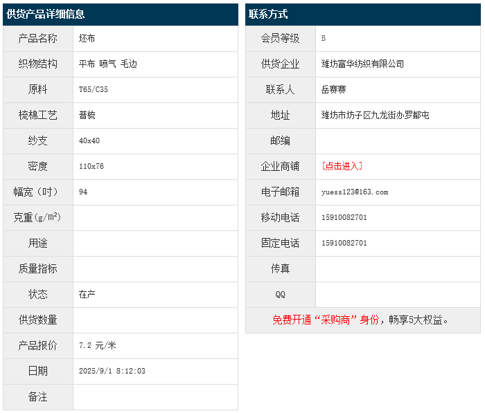 9月1日,濰坊富華紡織有限公司滌棉平布T65/C35 40x40 110x76 94" 噴氣 毛邊,報價為7.2元/米,實際成交價以協(xié)商為準。[點擊查看詳情]