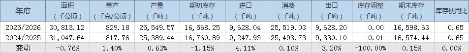 2025/26年度全球棉花期末庫存預(yù)估為1659.86萬噸(上月預(yù)估為1709.79萬噸),同比增加0.1%,2024/25年度期末庫存預(yù)估為1657.44萬噸。