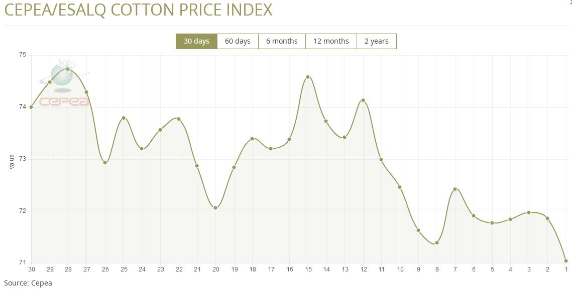 9月1日(周一),巴西CEPEA/ESALQ棉花價格指數(shù)報71.04美分/磅,較前一交易日下跌1.14%,較上月同期下跌1.14%。