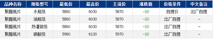 華東聚酯瓶片收于5870元/噸,漲跌值-10元/噸,成本走弱,聚酯瓶片工廠報價多穩(wěn)定,市場走低,帶動部分逢低補空需求,重心隨之下行。9-10月貨源報盤5870-6030元/噸,遞盤在5860-5880元/噸,較高5920-5940元/噸。