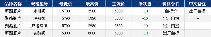 華東聚酯瓶片收于5830元/噸,漲跌值-10元/噸,聚酯瓶片工廠報(bào)價(jià)多穩(wěn)定,前期出貨后,底部?jī)r(jià)格上移,然而成本偏弱震蕩,高位報(bào)盤(pán)下移,成交重心震蕩偏弱。9-11月貨源報(bào)盤(pán)5800-5980元/噸,遞盤(pán)5790-5830元/噸,較高5850-5880元/噸,詢(xún)盤(pán)較少。