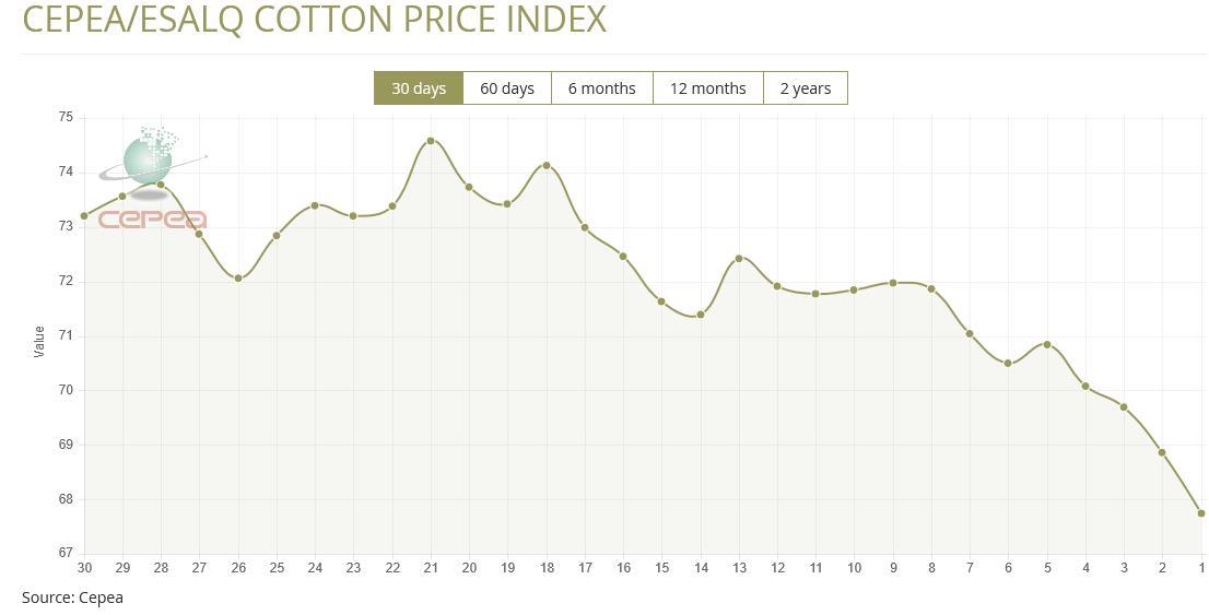 9月9日(周二),巴西CEPEA/ESALQ棉花價(jià)格指數(shù)報(bào)67.74美分/磅,較前一交易日下跌1.63%,較上月同期下跌5.73%。