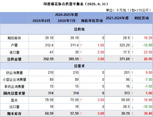 在政府取消進口關(guān)稅后,CAI將2024/25年度進口量預估上調(diào)20萬包至410萬包,較前一年度的152萬包高出約258萬包。Ganatra稱,截至8月31日,估計已有367.5萬包棉花抵達印度港口。