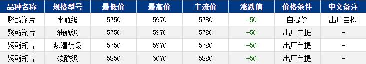 華東聚酯瓶片收于5780元/噸,漲跌值-50元/噸,原油拖累成本下跌,聚酯瓶片工廠報(bào)價(jià)多下調(diào)50元/噸,部分持穩(wěn),重心隨之下行。9-10月貨源報(bào)盤在5770-5970元/噸,9-10月合約報(bào)盤11貼水30至升水20,較高11升水60-70;詢盤5750-5780元/噸,合約11貼水20-30,較高5820-5850元/噸。