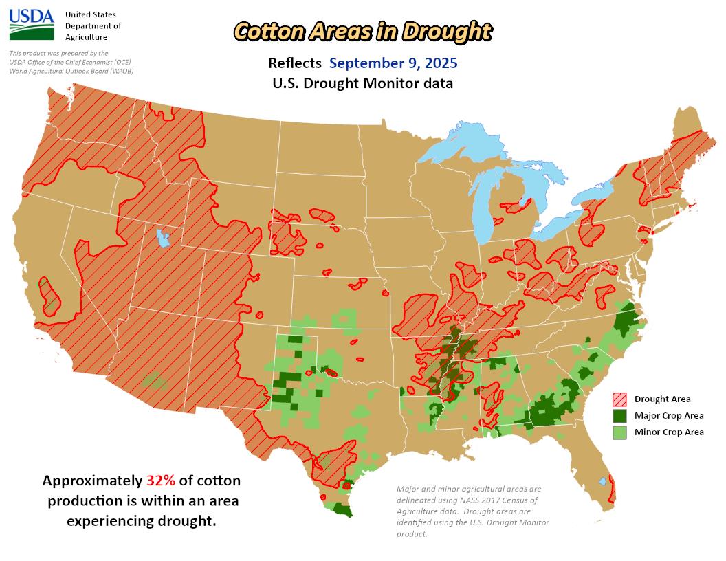 美國農業(yè)部(USDA)下屬的首席經(jīng)濟學家辦公室(OCE)當?shù)貢r間周四根據(jù)當日發(fā)布的美國旱情監(jiān)測圖整理的美國農業(yè)旱情文件顯示,截至9月9日當周,大約32%美棉產區(qū)受到干旱影響,高于之前一周的30%。