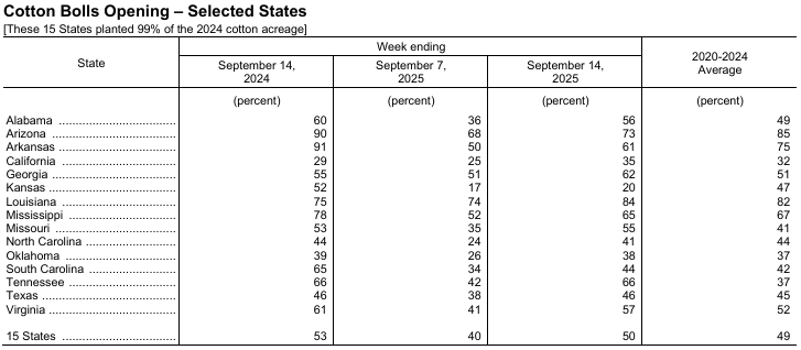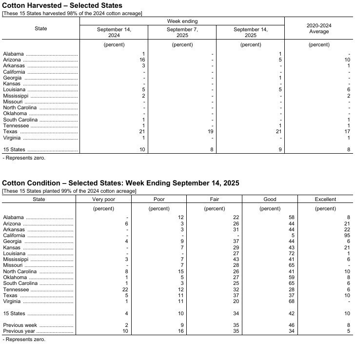 美國農(nóng)業(yè)部(USDA)在每周作物生長報告中公布稱,截至2025年9月14日當(dāng)周,美棉盛鈴率為50%,前周為40%,上年同期為53%,五年均值為49%。美棉收割率為9%,前周為8%,去年同期為10%,五年均值為8%。美棉優(yōu)良率為52%,前周為54%,上年同期為39%。