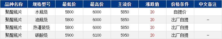 華東聚酯瓶片收于5850元/噸,漲跌值20元/噸,原油及原料偏暖運(yùn)行,聚酯瓶片工廠報(bào)價(jià)多穩(wěn),重心窄幅走高。9-11月貨源報(bào)盤5800-6000元/噸,9-11月合約報(bào)盤2511升水0+60,較低2511貼水20-70;詢盤5800-5850元/噸,較高5870-5890元/噸,9-11月合約報(bào)盤2511貼水40-70,較高貼水0-20。