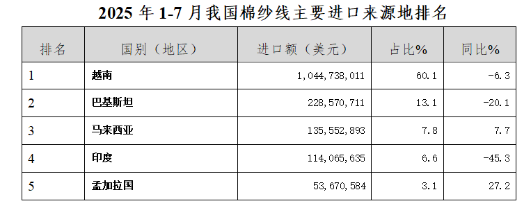 受美國(guó)關(guān)稅政策不確定性影響,我國(guó)對(duì)美國(guó)紡織服裝出口呈下行趨勢(shì),進(jìn)而導(dǎo)致進(jìn)口紗需求持續(xù)萎縮。從大類產(chǎn)品看,2025年1-7月進(jìn)口棉紗線17.4億美元,同比下降20.5%,進(jìn)口數(shù)量77.6萬(wàn)噸,同比下降14%;進(jìn)口化纖7億美元,同比下降17.7%;進(jìn)口絲線和羊毛、動(dòng)物紗線分別為163萬(wàn)美元、0.9億美元,同比增長(zhǎng)2.9%、6.7%。我國(guó)紗線進(jìn)口以棉紗線為主,占紗線進(jìn)口總額的70%。